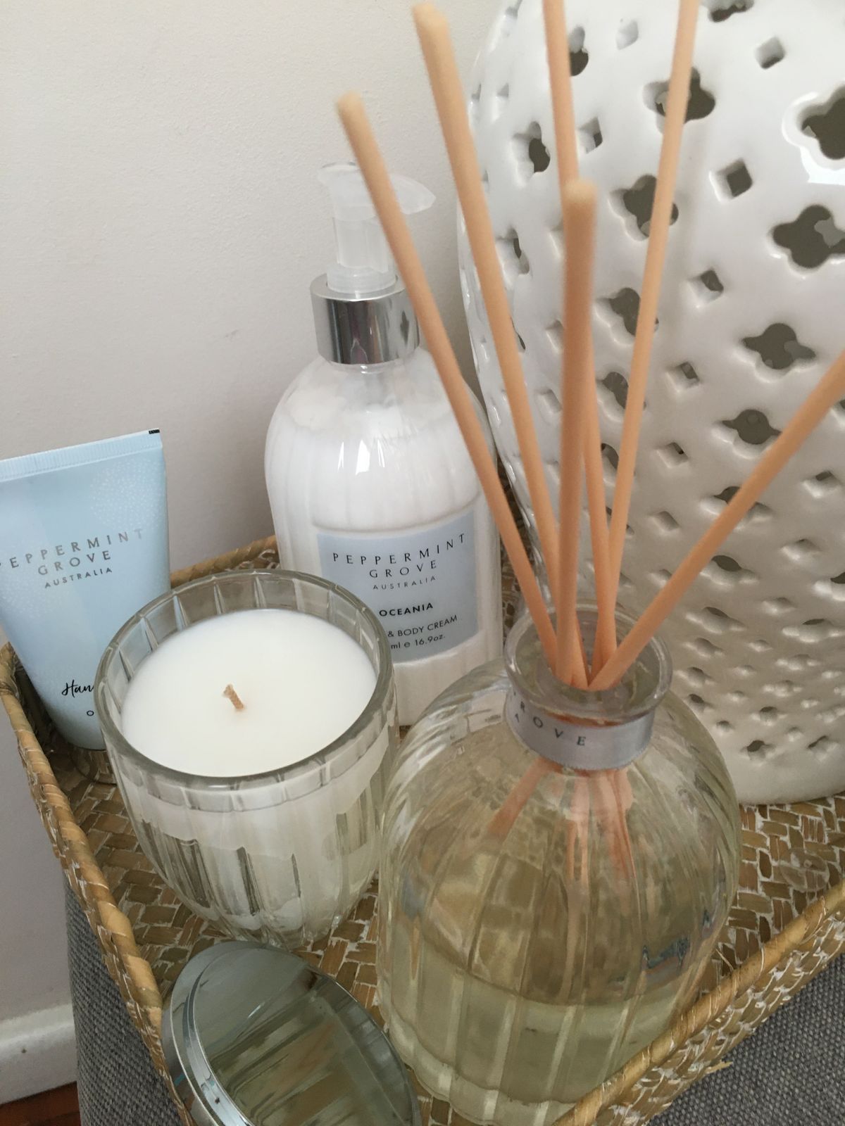 Beautiful fragrance that I've bought for years. This is one of my favourite candles from Peppermint Grove. It's not over powering, but fills the room with the fragrance of the ocean. I'm lucky to live by the sea these days, but I used to light this candle and wish I was there.